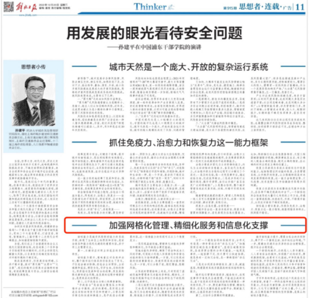 同日,解放日報刊載文章《用發展的眼光看待安全問題》,文章強調:要加強網格化管理、精細化服務和信息化支撐。