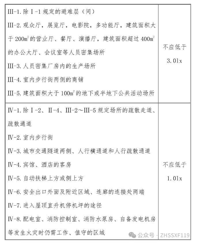 《消防應急照明和疏散指示系統技術標準》 GB51309-2018 中對設置照明燈的部位或場所疏散路徑地面水平最低照度要求。
