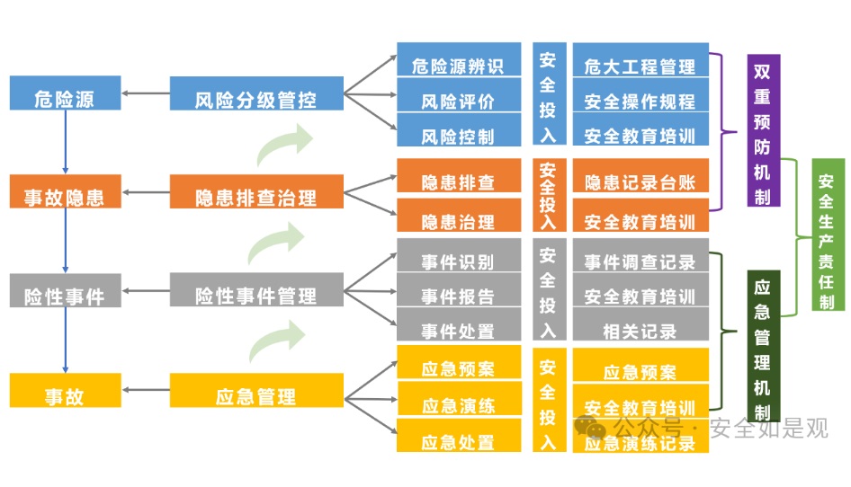 安全工作不是一個個分散的點,而是一整張面,面中的要素高度關聯。風險管控、隱患排查、應急處置,這些要素往往相互承接,前后關聯。比如,風險管控的措施失效就是隱患,應急處置的前提就是風險辨識評估。因此,對于安全從業者來說,要從系統上抓好安全工作,首先要對“關聯”二字高度敏感與理解,站到面上看待問題,然后再對各個點進行管理,會達到事半功倍的效果。
